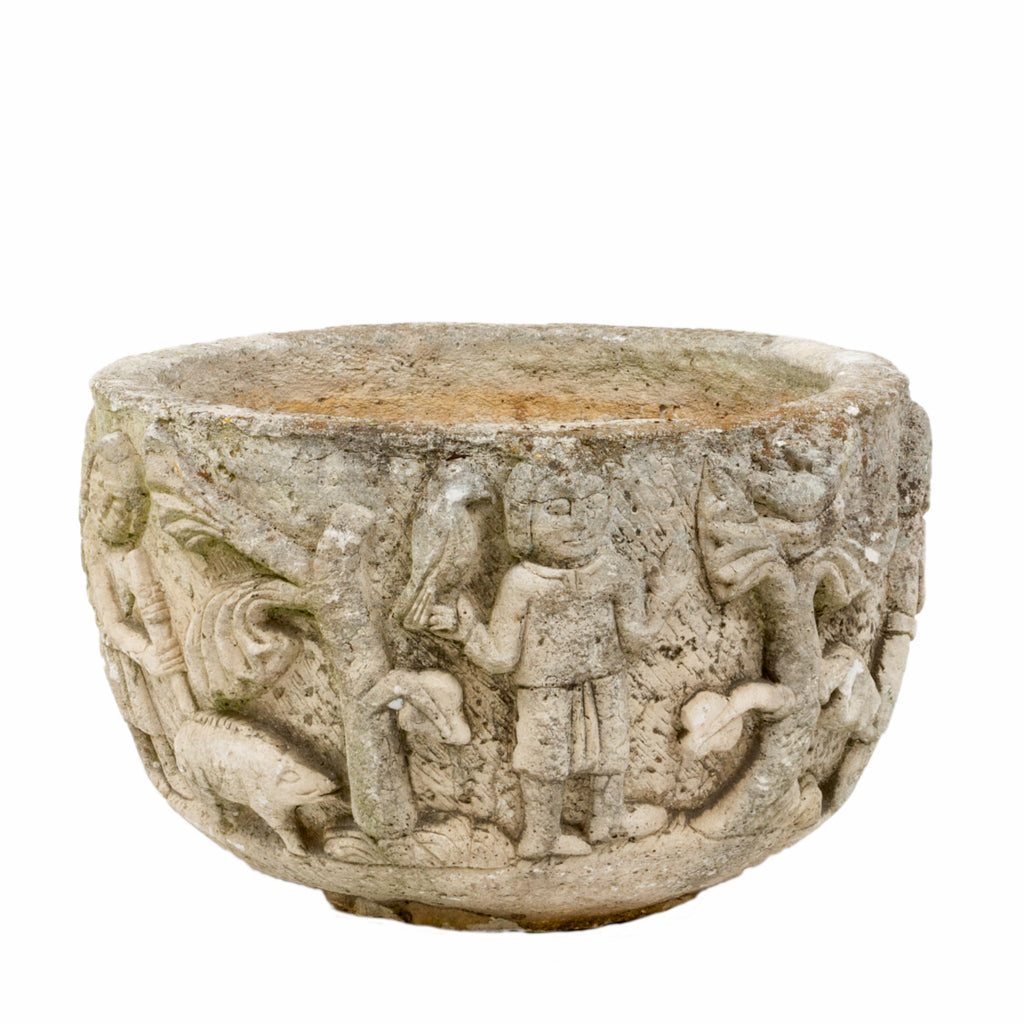 Antique French planter was made from reconstituted stone in the late 1800s. The maker used a natural stone composite as it’s base, so it appears to be carved into stone. After years of natural weathering this intricately decorated vessel with it’s Medieval figures, tells a story. A unique addition to a patio, garden or rustic interior. 20" x 20" x 14" Additional shipping charges will apply. Please email customer service for details. All sales final.