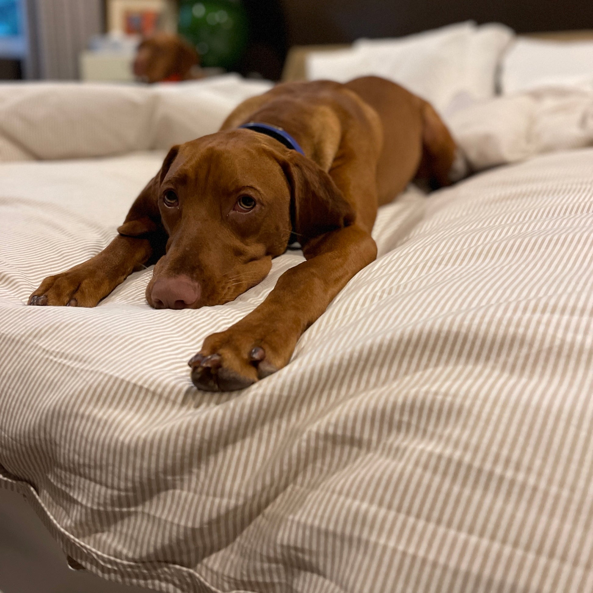 The Khaki Stripe Cotton-Chambray Duvet Cover features a 2” flange with double-needle stitching and a hidden-button closure that has ties each corner to hold your duvet insert securely. Shams are sold separately.