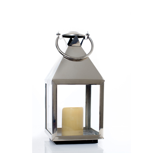 Handcrafted glass lantern with a polished steel base and handle. A subtly modern centerpiece when showcased alone, or group together for a warm and welcoming glow. 9” x 9” x 27”