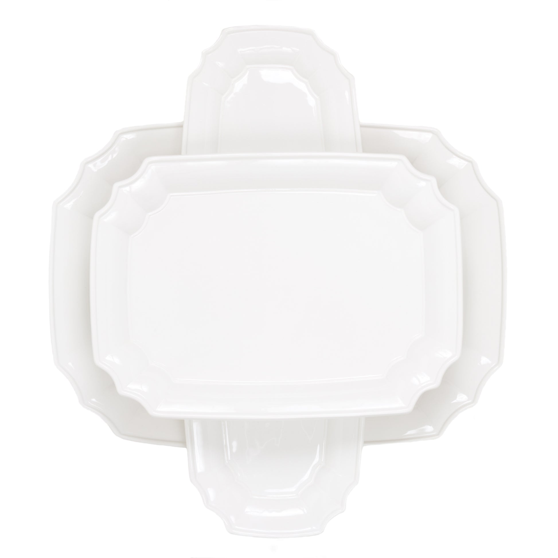 This scalloped platter with classic Italian detailing adds a touch of style to your table. Easy for everyday entertaining or special events, this modern style is finished in our signature white glaze. Dishwasher Safe. 16" x 11”. Exclusively Hudson Grace
